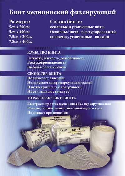 Также бинты удобно использовать в качестве фиксирующего материала при переломах, вывихах, ушибах. Повязка с таким бинтом не только прочно фиксирует поврежденный сегмент, но и позволяет сохранить подвижность мышц, что снижает риск развития осложнений от отеков.