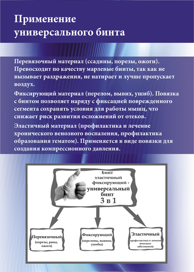 Такие свойства бинта, как высокая растяжимость и воздухопроницаемость, делают его незаменимым в качестве эластичного материала в повязках компрессионного давления для профилактики и лечения хронического венозного воспаления, профилактики образования гематом.